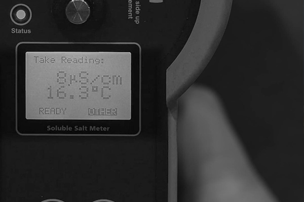 The Soluble Salt Meter is a patented design that provide a hand held, automated method for detection of soluble salts on surfaces.